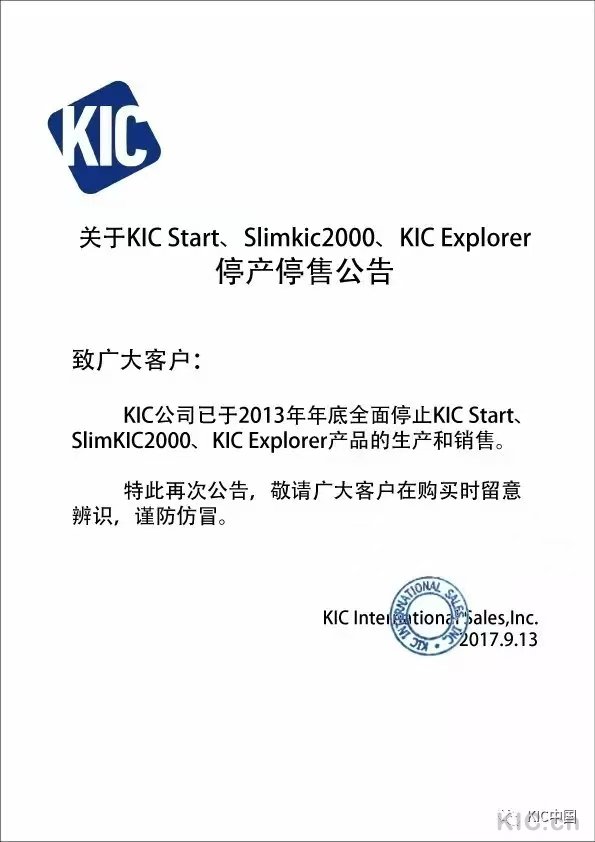 关于KIC Start,slimkic2000,KIC Explorer产品 停产停售公告 未知 | 2025-10-26 12:39 | 点击: | 公告 关于KIC Start,slimkic2000,KIC Explorer产品 停产停售停止提供技术服务的公告 致广大客户: KIC公司已于2013年年底全面停止KIC Start、SlimKIC2000、KIC Explorer产品的生产和销售,并不再提供相关的技术服务。 特此再次公告,敬请广大客户在购买时留意辨识,谨防仿冒。 KIC International Sales,Inc. 2017.9.13