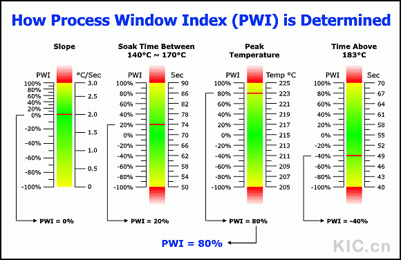 KIC 2000使用PWI值来描述曲线好坏,小于100%表示曲线合格的,大于100%表示不合格,0%表明处于制程的中心位置。